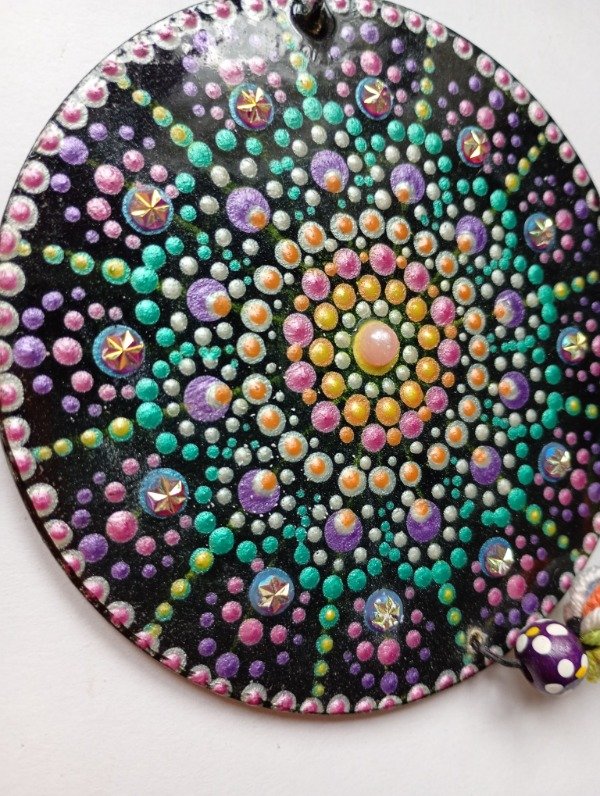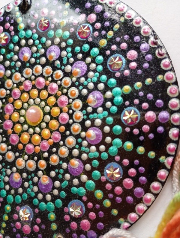 Mandala con borlas, para colgar, pintada a mano, con la técnica de puntillismo. 10 CM de diámetro